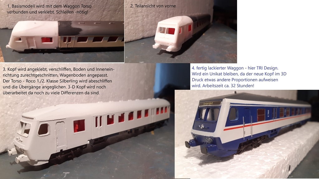 angepasst werden, Dachstärke, Seitenmaße usw. . Der Umbau ist sehr umfangreich, von dem Ankleben des Kopfes an den Waggon Torso bis zum verschleifen und verfüllen mit Kleber, Anpassung des