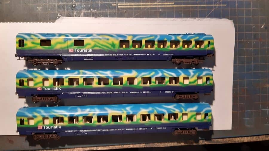 Alle Modelle sind in Airbrushlackierung entstanden. Die Modelle BR 103 220 und BR 218 416 und BR 218 418 aus den ersten beiden Galerien sind von mir lackiert worden und wurden mit Decalfolie beschriftet. Die Modelle Kehrer/Touristik waren ein gemeinsamer Versuch beider Unternehmen, die von mir aber auf Grund der Materialqualität nicht weiter verfolgt wurde. Die Modelle Tillig/Ristow aus den Jahren 2007 bis 2009 waren dagegen ein Erfolg mit 0% Reklamationsrate. Insgesamt wurden 3 Chargen ausgeliefert und gefertigt: Modell der BR 218 418 – Lackierung Ristow, Bedruckung und Modellgestellung Tillig mit einer Gesamtanzahl von 176 Stück. Die 2.Charge umfasste das 3-er Set Personenwagen. Hier wurde auf meine Anregung hin die Abänderung auf Steildächer sowie der Unterboden mit Schürzenverkleidung an den Waggons in Vergleich zu den Regelmodellen vorgenommen. Insgesamt wurden 606 Stück lackiert, somit 202 Sets, die zertifiziert wurden. Es folgte die 3.Teilanfertigung, die den Speisewagen betraf, von denen insgesamt 129 Modelle von mir lackiert und von Tillig bedruckt wurden. Viele Kunden haben bis heute die Chance genutzt, weitere Modelle von mir im „alten“ Airbrushdesign und in Airbrushlackierung anfertigen zu lassen, um somit ihren Zug zu verlängern.